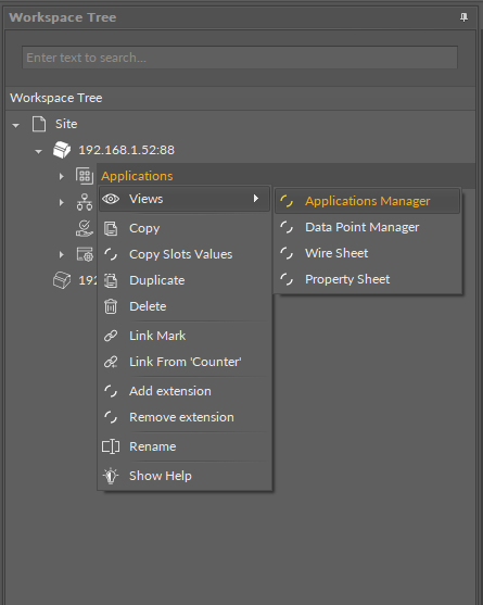 The Applications Manager view is also automatically opened if the Applications container is double-clicked in the Workspace Tree window.