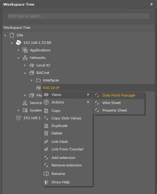 Accessing the Data Point Manager from the context menu of RAC18-IP (LocalDevice) component in the Networks container
