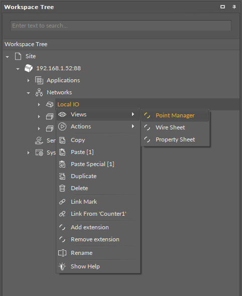 The Point Manager view is accessible from the context menu of the LocalIO component. It is also automatically opened if the LocalIO component is double-clicked in the Workspace Tree window.