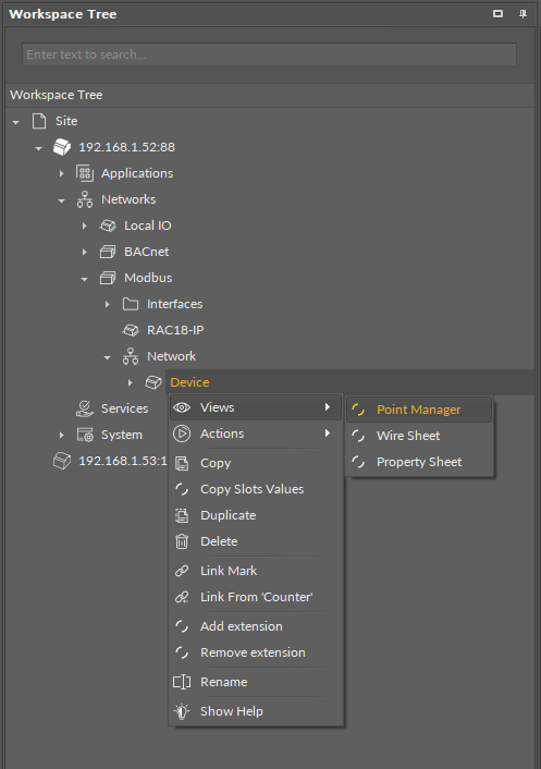 The Point Manager view is accessible from the context menu of the Device component. It is also automatically opened if the Device component is double-clicked in the Workspace Tree window.