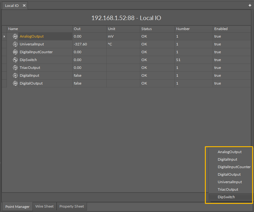 The LocalIO Point Manager view is available for the LocalIO component. It lists all I/O points added to the LocalIO component, and shows their: