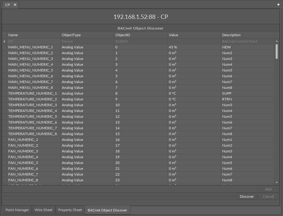 The BACnet Object Discover view allows to automatically discover points available in the devices added to the BACnet network.