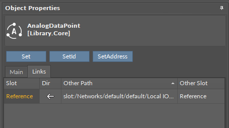 - As the Reference links connect elements from the Applications container (Data Points) and the Networks container (network points), in the Wire sheet they are displayed as bubbles: on the left side of the Reference slot for the input-type linking, and on the right side of the Reference slot for the output-type linking: