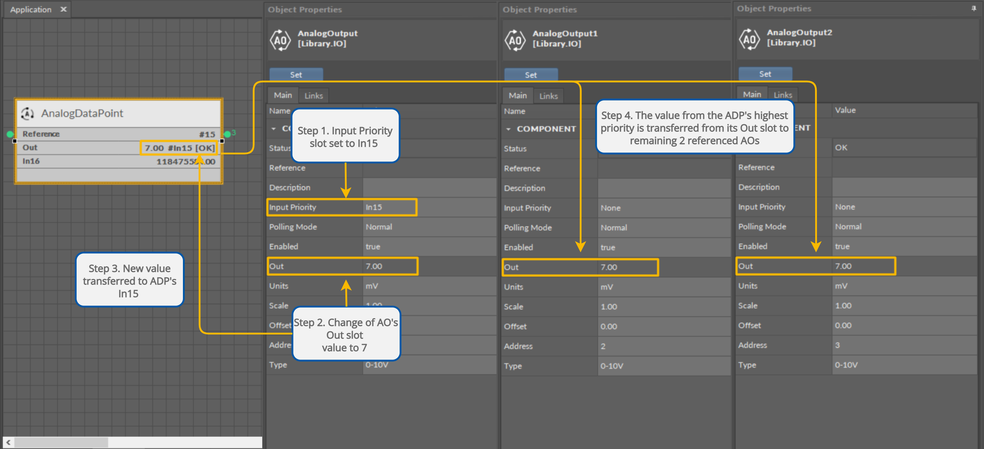 Another innovative feature of the Reference linking is that the Reference link is able not only to return status from the network point but also to return its value. The network point's slot, Input Priority, is designed to identify the Data Point's priority, which the network point will transfer its value back to. For example, if the network point's Input Priority slot is set to In16, it will transfer its value back to the Data Point's 16th priority slot. In turn, if this value is the highest priority for the Data Point, it can distribute it to all network points linked with the Reference link. This way, if there are more output-type network points linked with the Data Point, and one of them changes its value and sends it back to the Data Point, thanks to the bidirectional Reference link, the Data Point can synchronize values in all linked network points.
