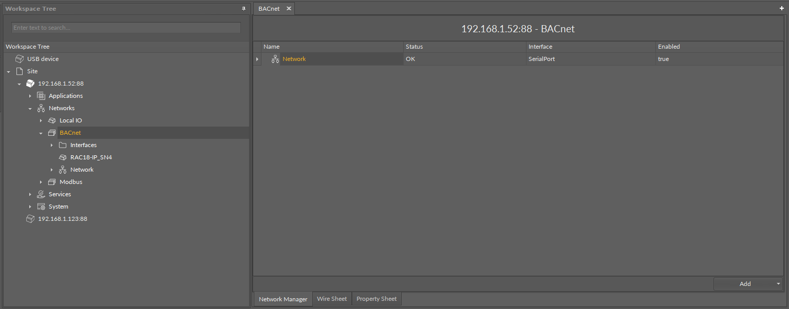 The Network Manager view is accessible from the context menu of the BACnet component. It is also automatically opened if the BACnet component is double-clicked in the Workspace Tree window.