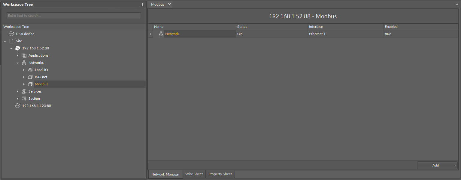 The Network Manager view is available for the Modbus component. It lists all Modbus networks configured on the device's ports. The Network Manager view shows the statuses, ports (which the network is configured on), and enabled or disabled states of the the network. Once the network, listed in the Network Manager, is double-clicked, the respective Network component is opened.