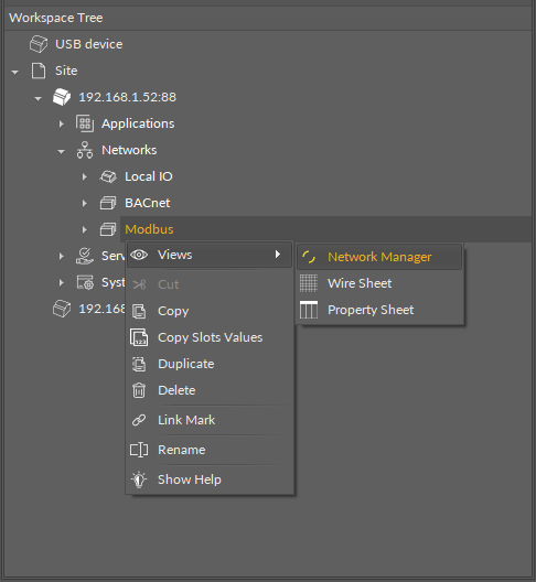 The Network Manager view is accessible from the context menu of the Modbus component. It is also automatically opened if the Modbus component is double-clicked in the Workspace Tree window.