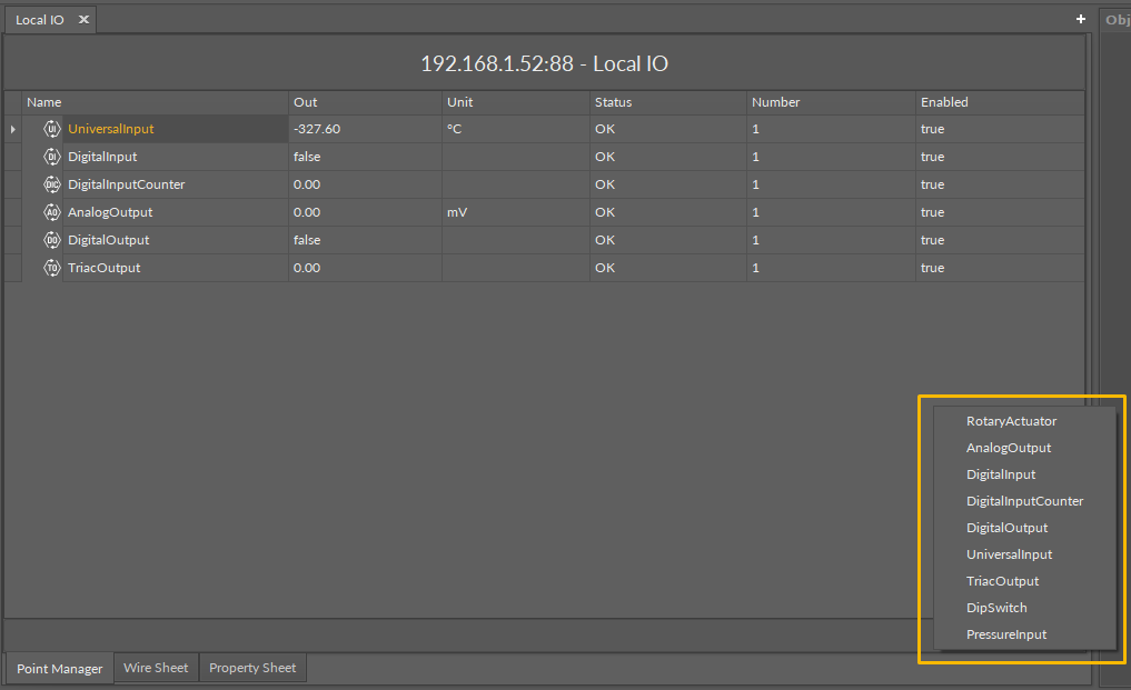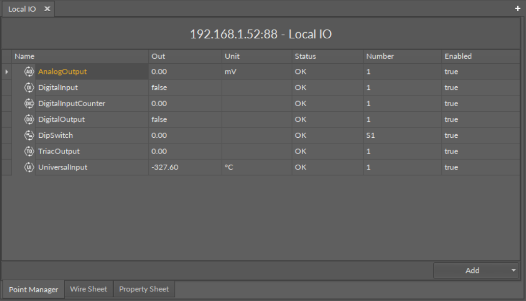 The LocalIO Point Manager view is available for the LocalIO component. It lists all I/O points added to the LocalIO component, and shows their: