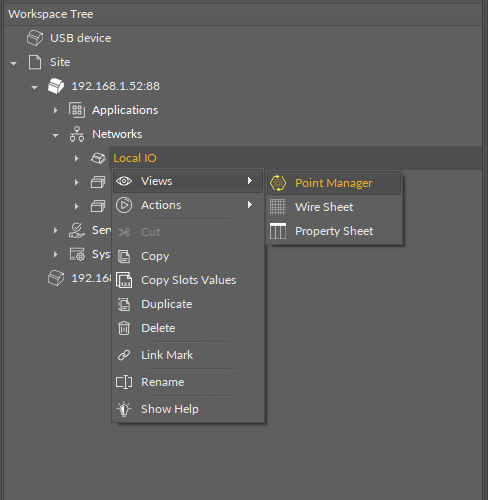 The Point Manager view is accessible from the context menu of the LocalIO component. It is also automatically opened if the LocalIO component is double-clicked in the Workspace Tree window.