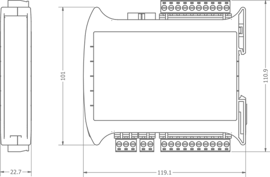 The appearance and dimensions of the module are shown below. The module is mounted directly to the rail in the DIN industry standard. Power connectors, communication and IOs are at the bottom and top of the module. USB connector configuration and indicators are located on the front of the module.