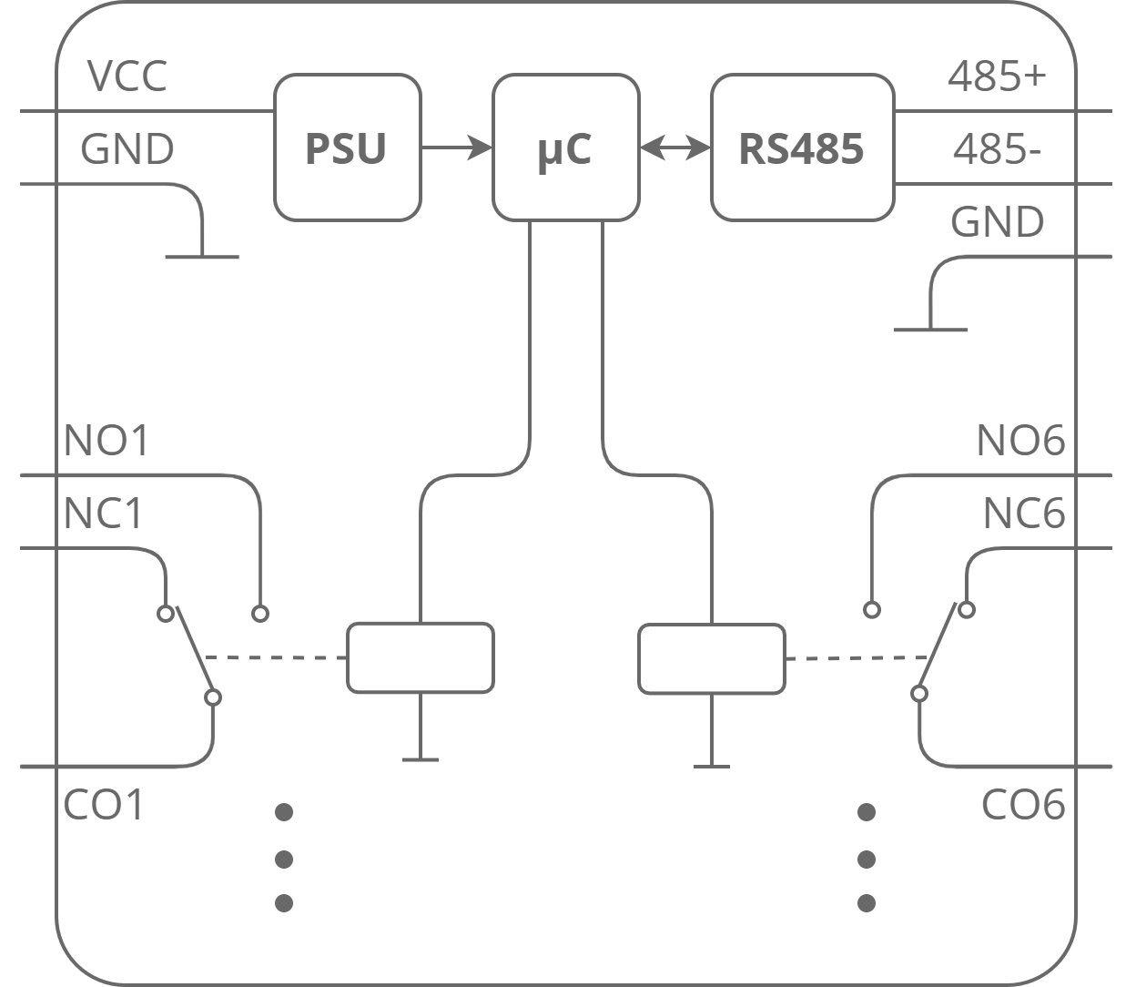 Thanks to this solution, it is enough to connect the power supply and RS485 communication to one of the devices in the group, and the others will be powered and communicated with ribbon cable.