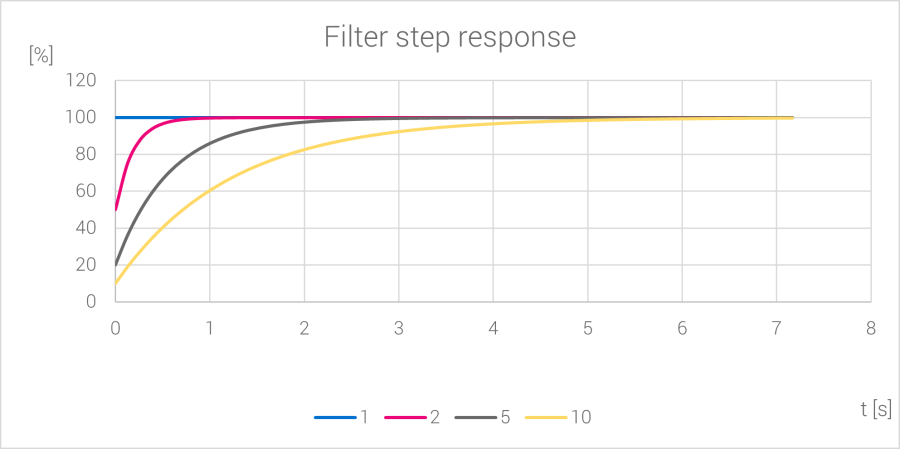 If the measured signal is interrupted, it is possible to eliminate the disruptions by switching the lowpass filter on. It is possible to configure the filter for all inputs (it is not possible to enable the filter for only one input). The filter parameter corresponds to the filter time constant. Step response of the filter is shown in the graph below.