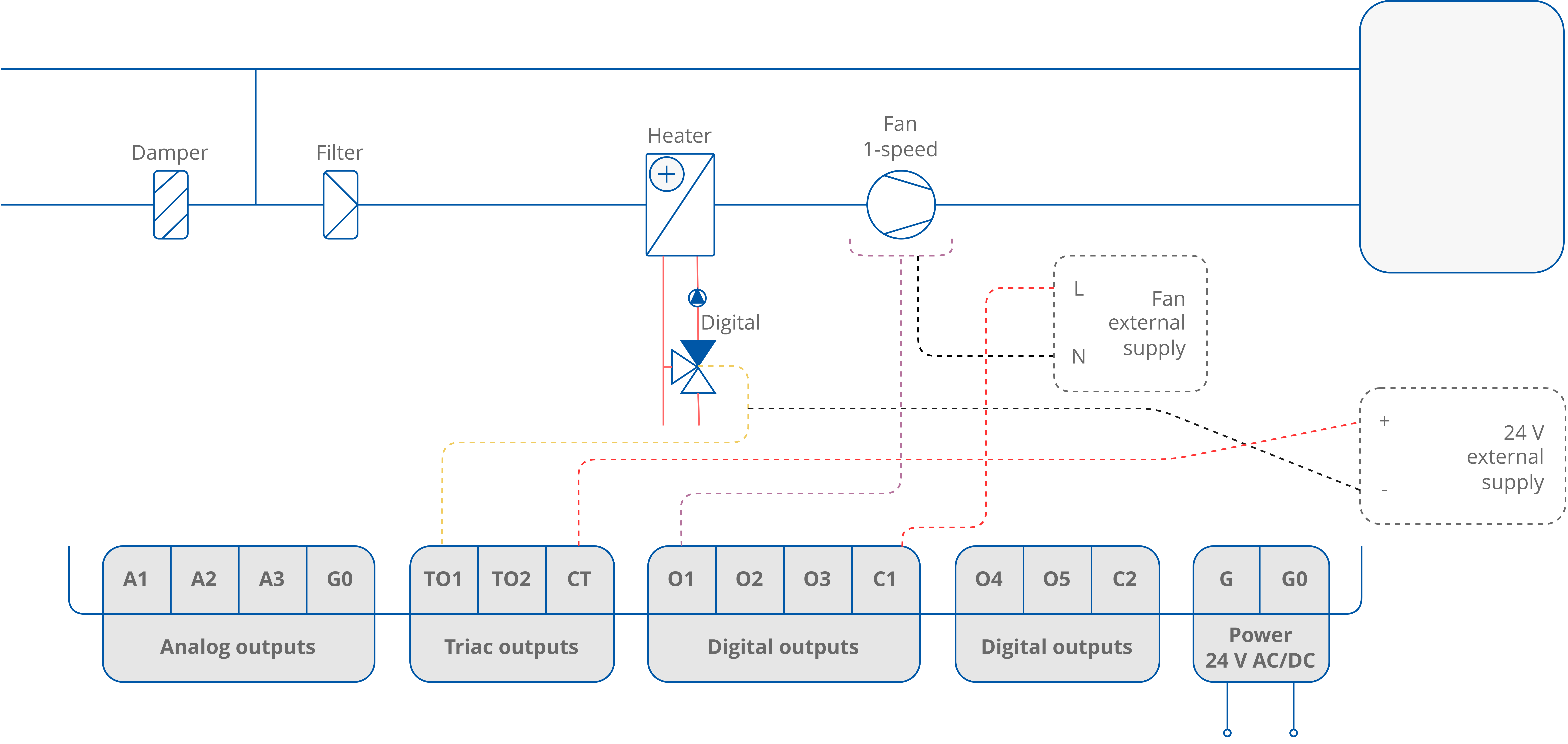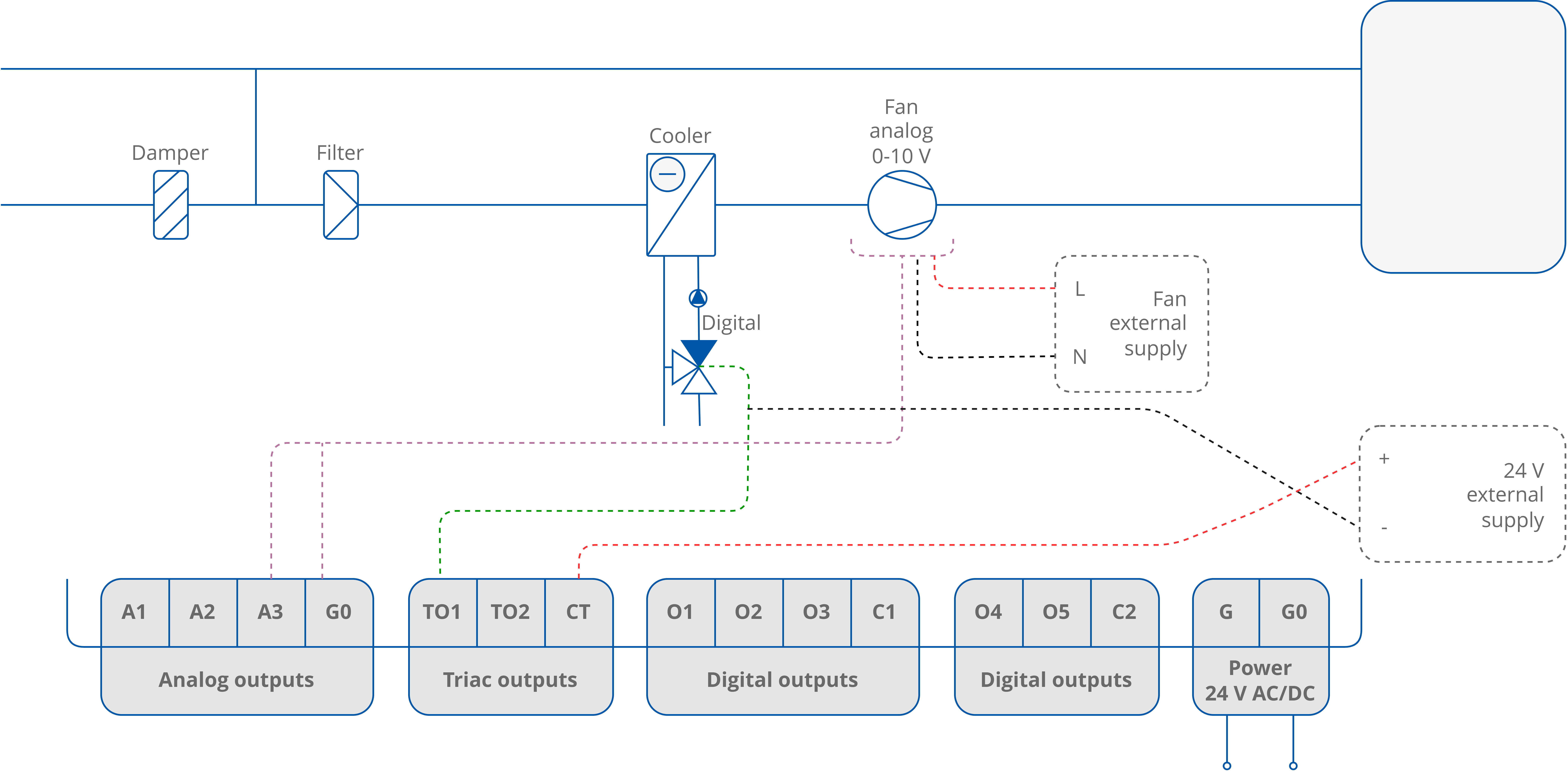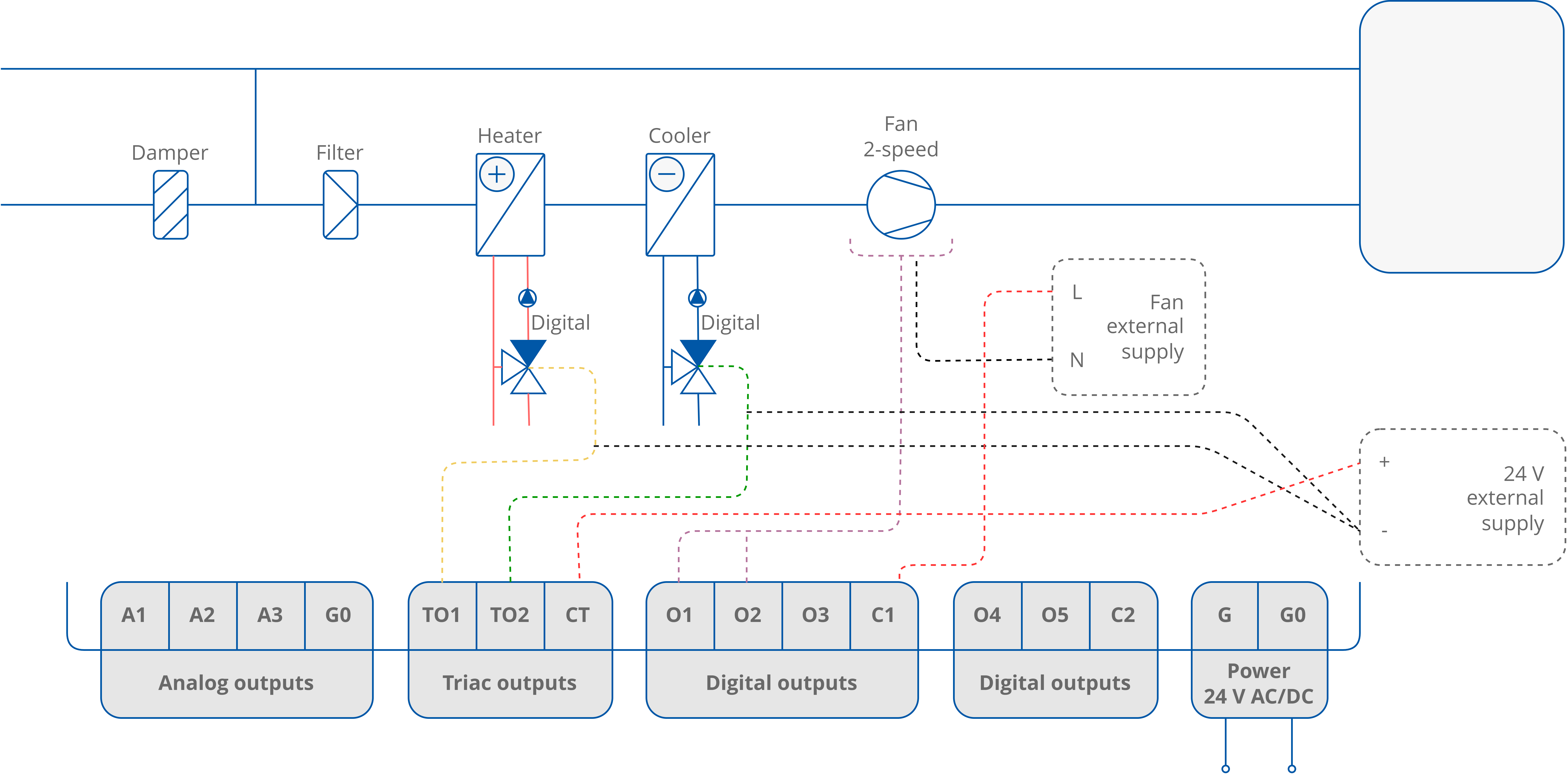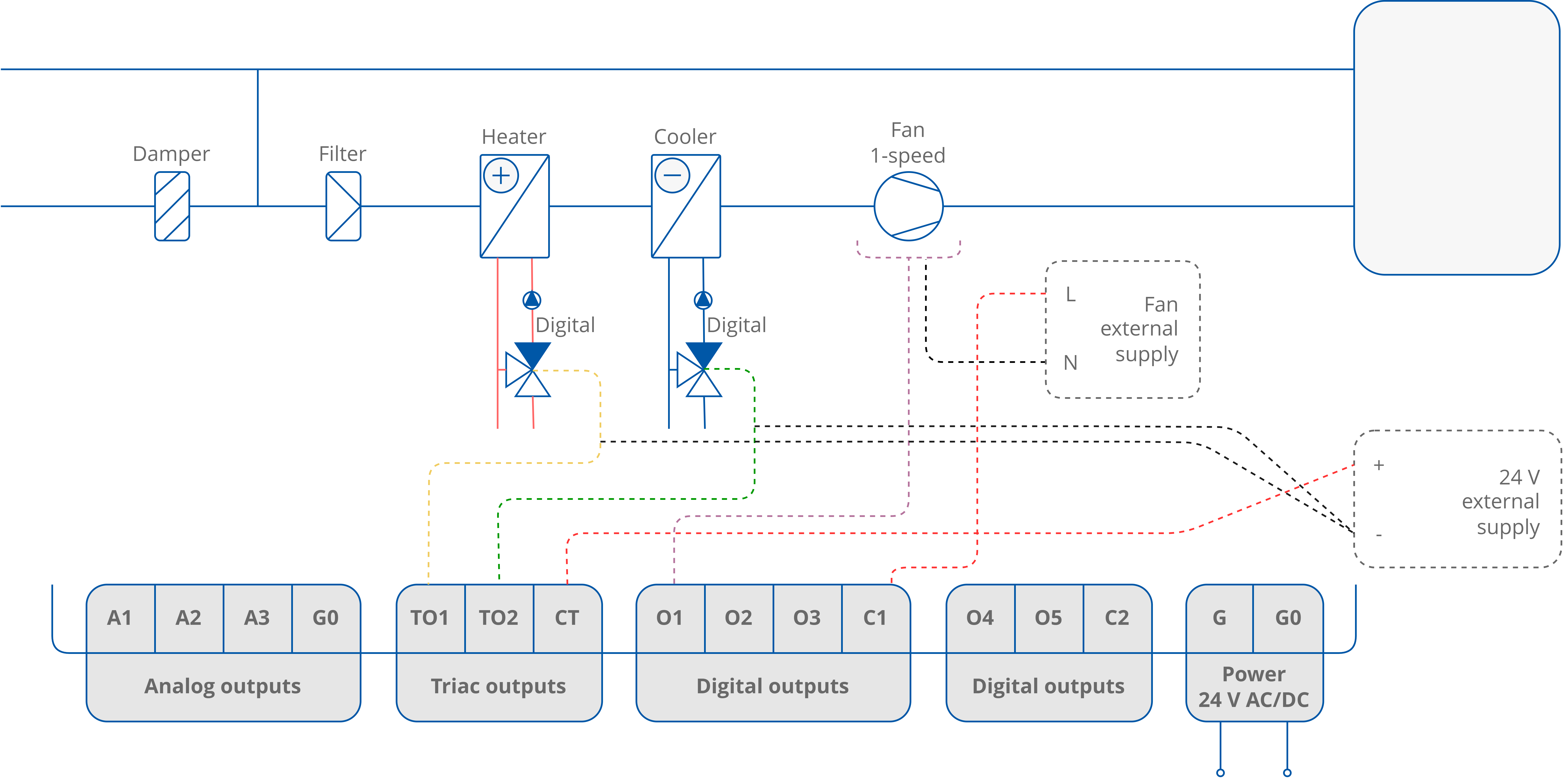 The 24 V power source for heater and cooler actuators can be taken from L2/N2 connectors.