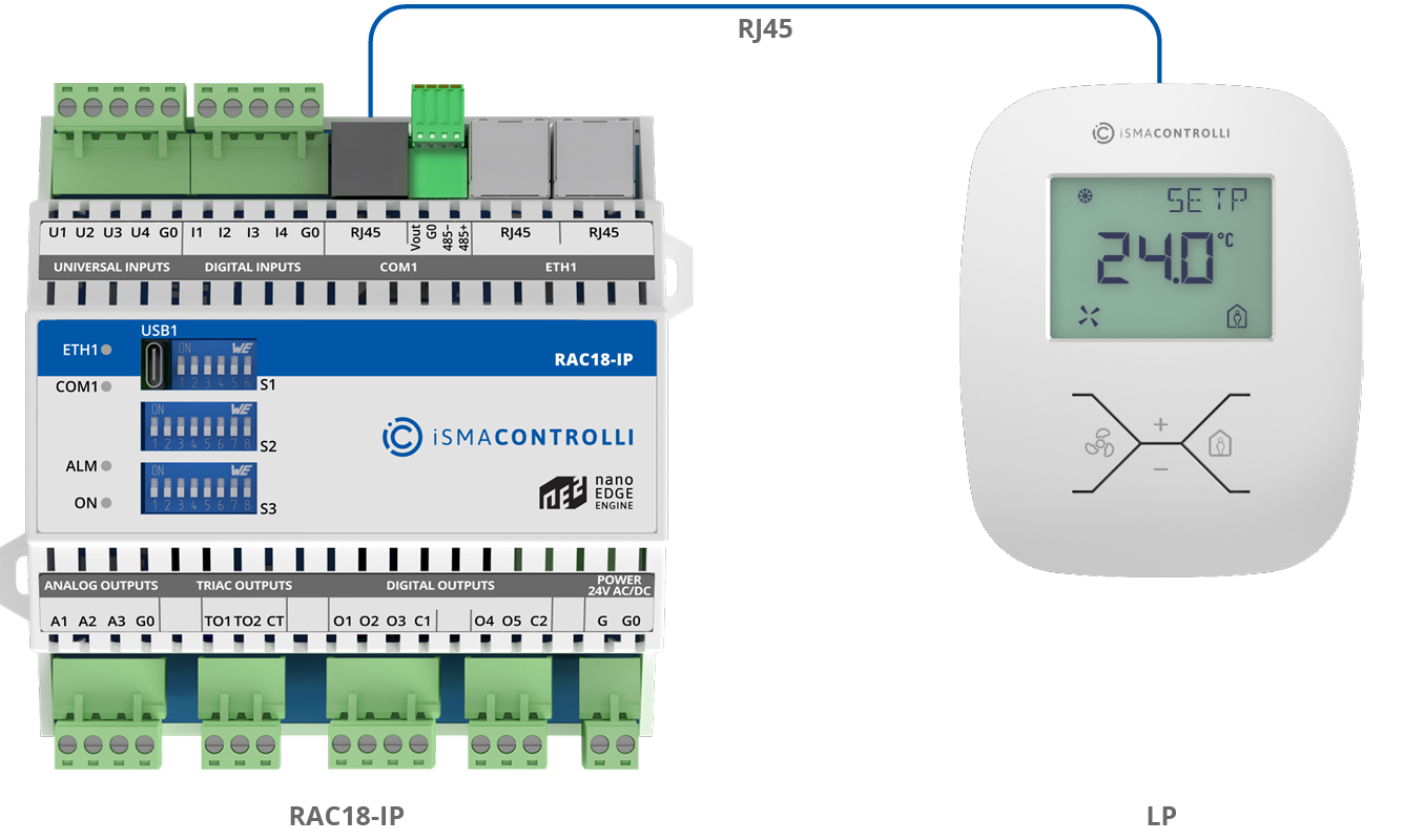 The LP room panel is connected to the RAC18-IP controller’s RJ45 socket. This connection provides panel power supply and communication.