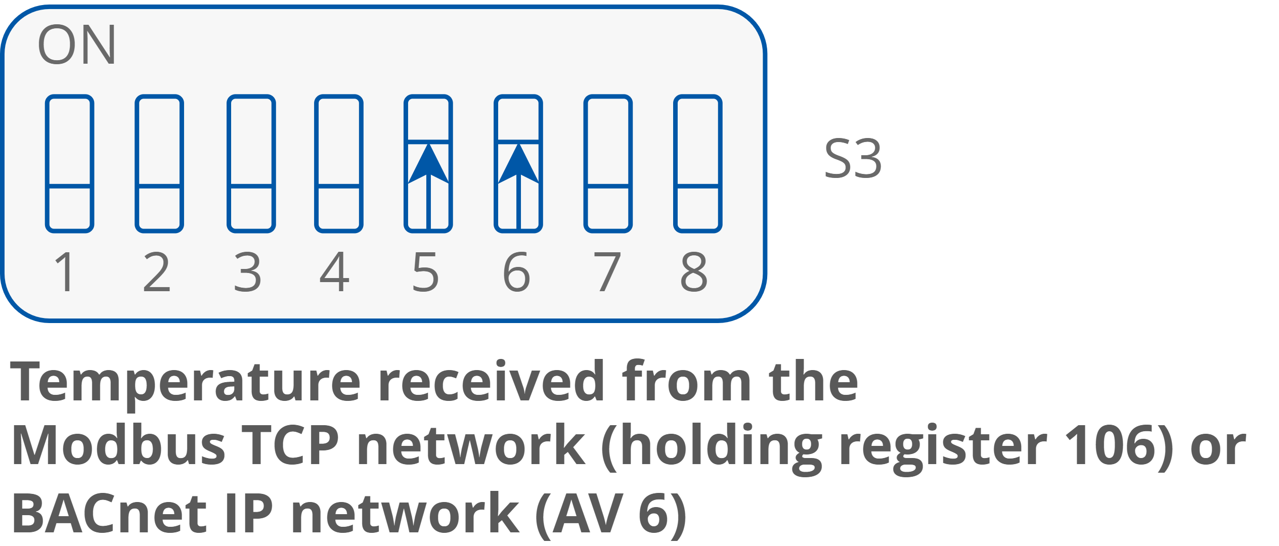 The temperature control value source has to be specified with the DIP switches 5 and 6. By default, the sensor’s type, served by the controller’s inputs U1 and U3, is the 10K3A1 NTC.
