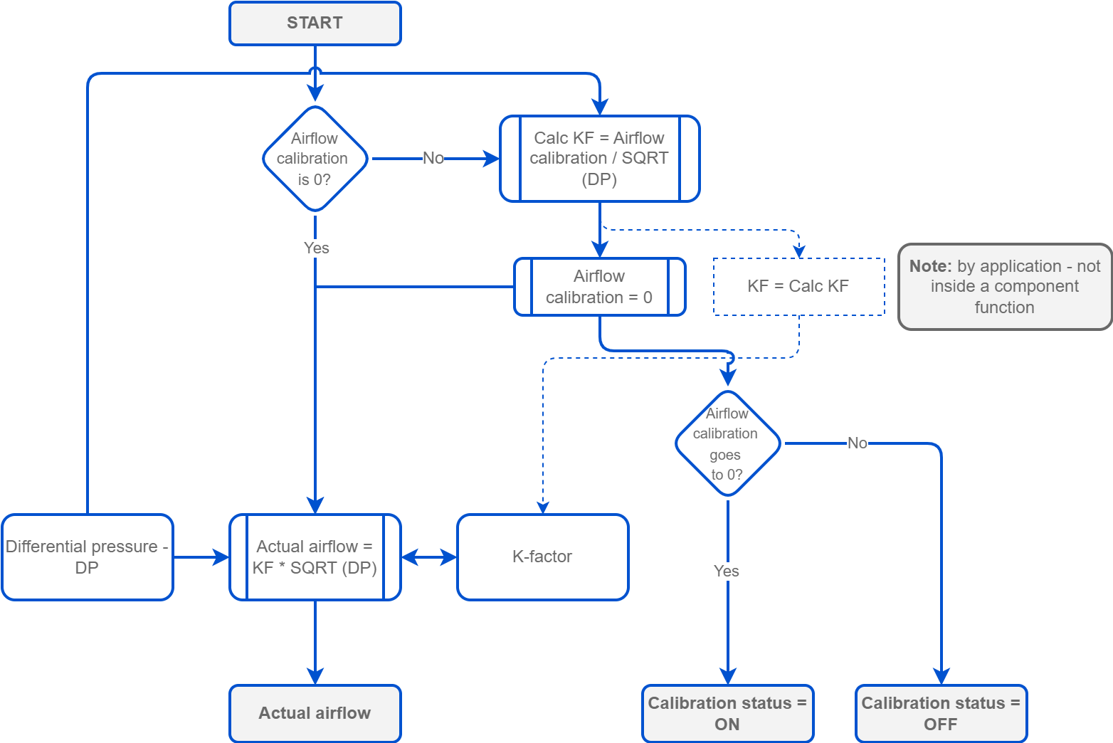 During the calibration process, the balancing technician takes the actual measurement of the airflow and enters the measured value into the AirllowCalibration component (in the AirFlowCalculator folder of the VAV application), triggering a recalculation of the pre-set K-Factor parameter so that the airflow indicated by the device corresponds to the actual airflow.