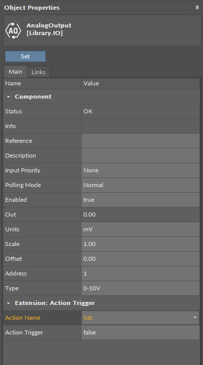 The AnalogOutput component includes an action that allows to set its Out value in case no Data Point class component is linked to it.