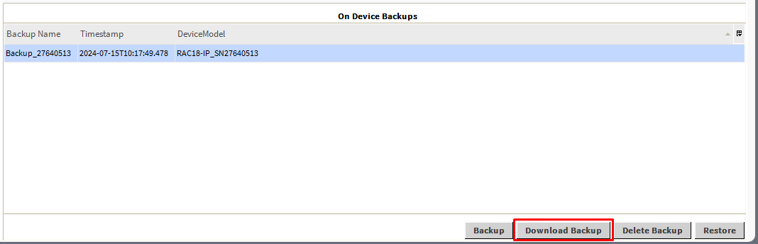 Click the Download Backup button to download the backup from the device to the local station.