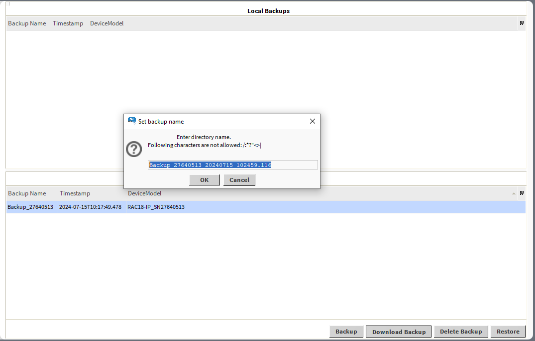 The Set backup name pop-up informs about characters that are not allowed to be included in a backup’s name. If one of them is, the action will be aborted and the following prompt will be displayed:
