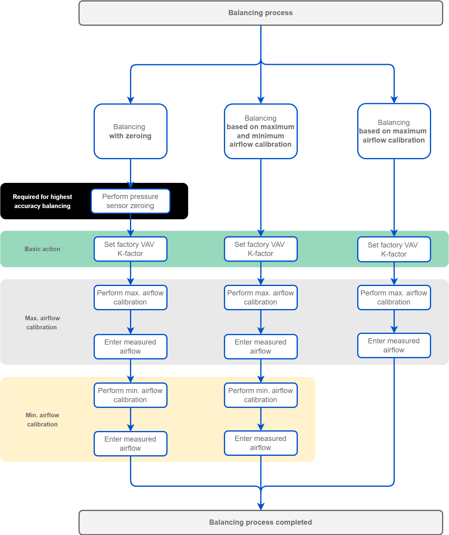Pressure sensor zeroing is a part of the VAV balancing process, which aims at eliminating a constant measurement error of differential pressure on a built-in pressure sensor. The zeroing process involves the following steps: