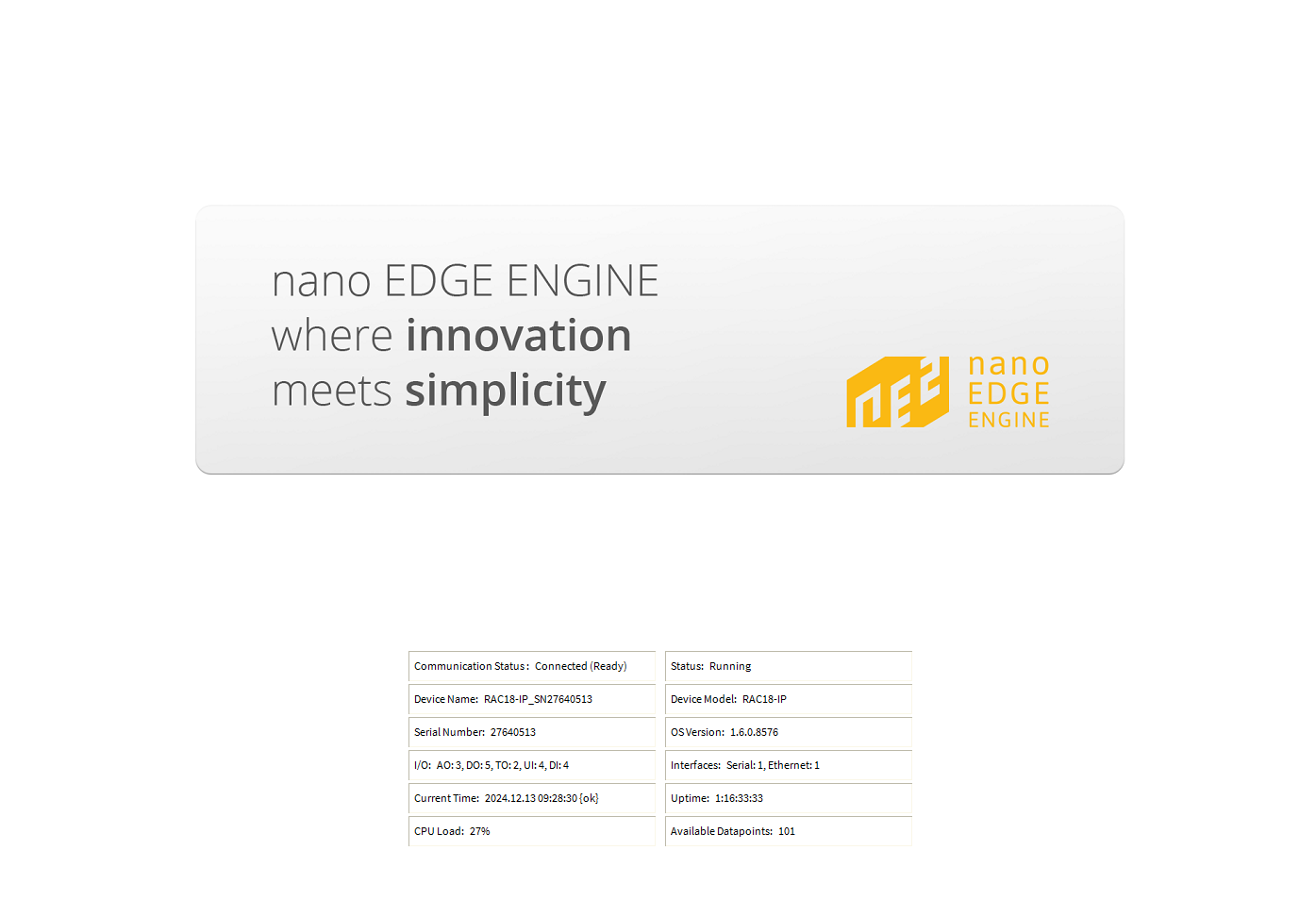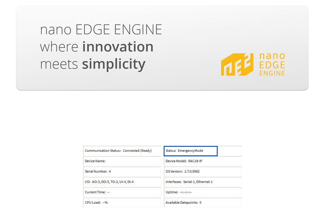 The system and application(s) of the nano EDGE ENGINE controllers are stored on an SD card. If the SD card is not detected in the device or the device detects frequent reboots (at least 5 times in 6 minutes), which prevent correct operation, the device enters an emergency mode.