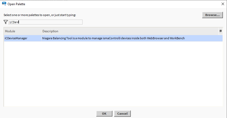 To start using the iC Device Manager service, go to the Palette window (in iC Workbench or other Niagara tool) and select the Open Palette option.