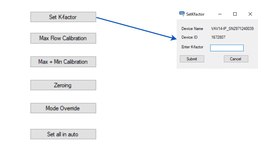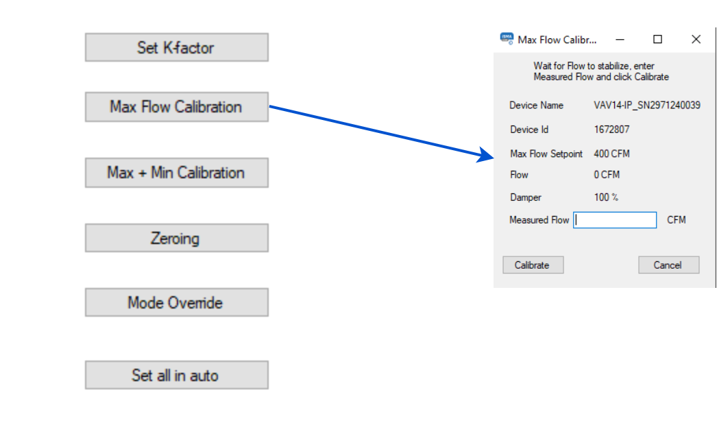 In step 1, measure the airflow and enter the measured value. Then, proceed to calibration (using the Calibrate button). The action will return a newly calculated K-factor.