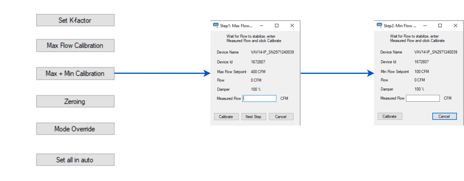 After completing step 1, continue to step 2, the minimum airflow calibration. Enter the measured airflow value and use the Calibrate button.