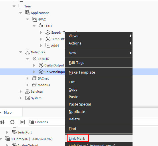 As network points are situated in the Networks container and Data Points are situated in the Applications container, Reference links are created using the Link Mark and Link From options from the context menu.