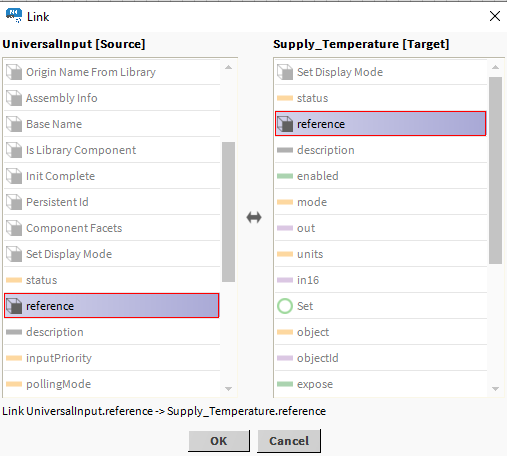 Reference link is designed specifically to connect Data Point class components (in the Applications container) with network point class components (in the Networks container). A reference link transfers values along with the component's status.