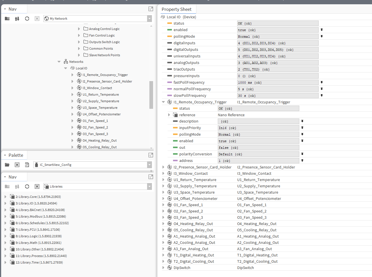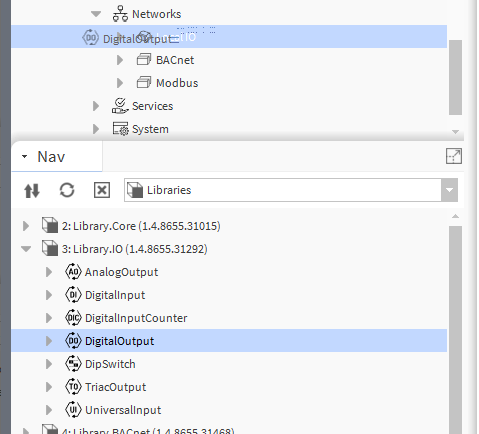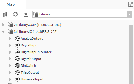 To setup local inputs and outputs on the nano EDGE ENGINE device, expand the Library.IO. The IO components must be placed in the Networks container, under the LocalIO component.