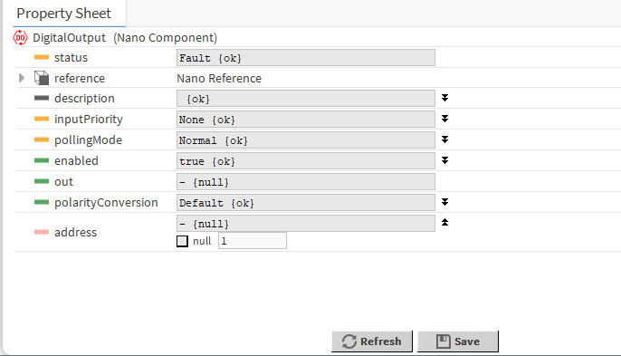 Double-click the IO point to open its property sheet. By default, the status of the point is Fault because the address must be set. Configure the point's address in the Address slot and click Save.