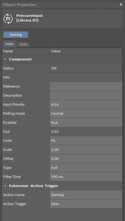 The PressureInput component is an I/O point (network point class) component, which allows to read data from a built-in pressure sensor operating in range of -500 to 500 Pa.