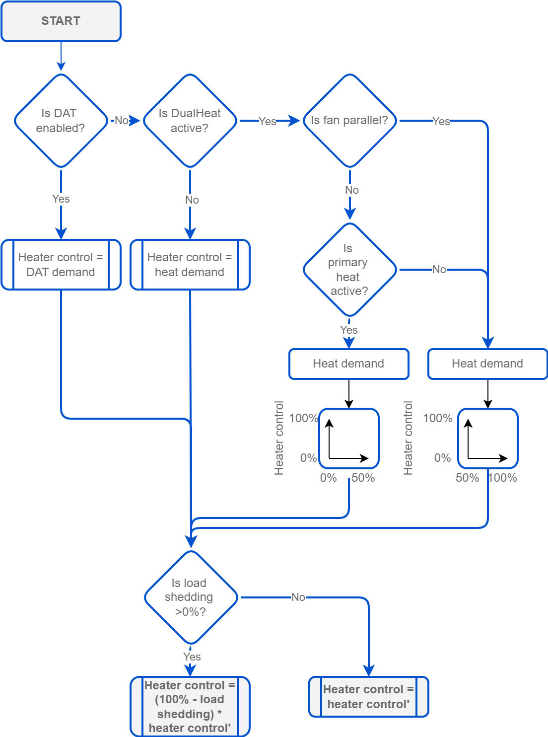 The DualHeat function for reheater allows to meet energy efficiency requirements by allowing to select between two modes of heating. The DualHeat function is activated according to the setting of the HeatDamperPriority variable:
