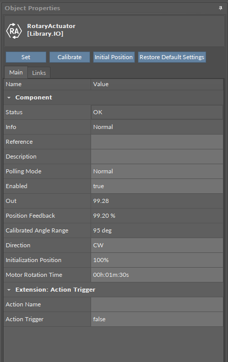 The ActionTrigger extension is designed to invoke any action that is available for the component. The extension triggers an action selected in the Action Name on the rising edge of the Action Trigger slot. If the action has parameters to set, the parameter is taken from a relevant slot automatically added to the extension (Analog Value/Binary Value/String Value).
