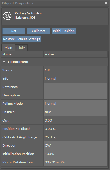 In order to operate properly, the RotaryActuator component must be located under the Local IO component in the Networks container.