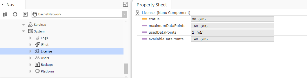 To integrate with Niagara, it is important to note that only Data Points can be exposed over networks. Each nano EDGE ENGINE device has a limit on the number of Data Points that can be exposed. The available number of Data Points can be found in the License component in the System container.