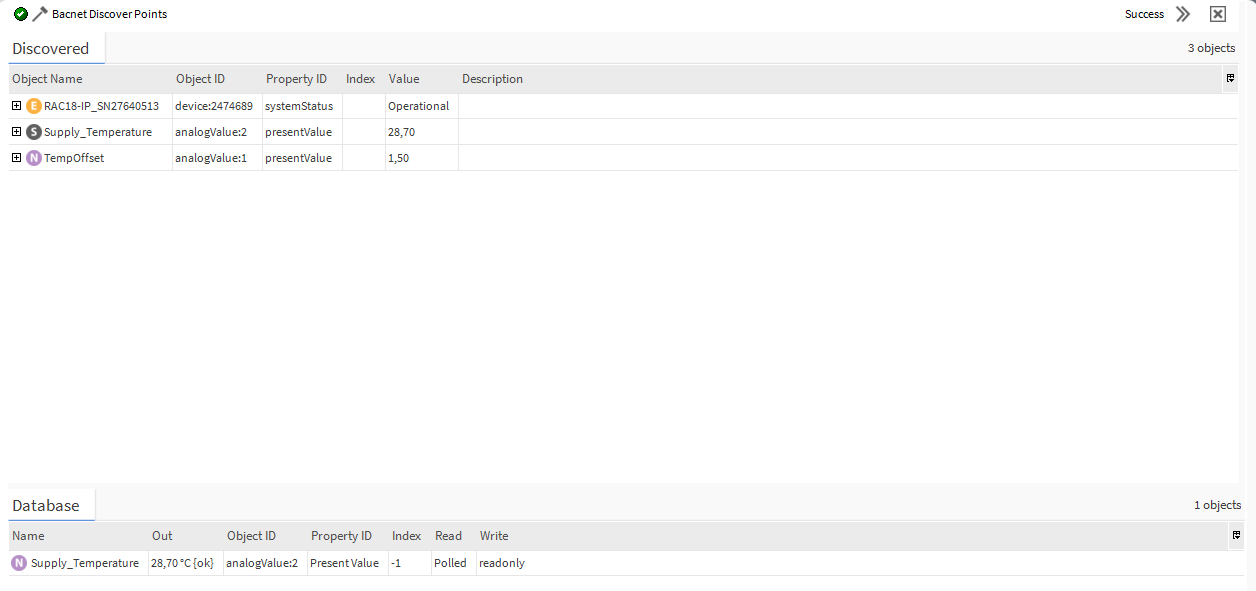 To integrate points, go to the device → Points and click Discover. Add required points to Niagara database.