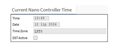 • Current Nano Controller Time: shows the currently set time, date, and time zone as well as indicates whether the Daylight Saving Time is currently active;