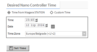 • Desired Nano Controller Time: allows the user to set the time on the controller directly from the Niagara station or to set a custom time.
