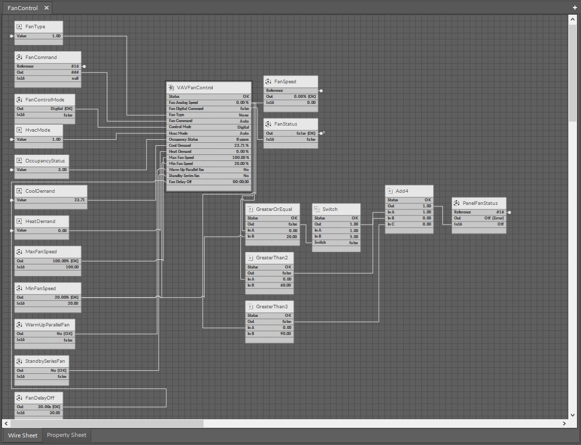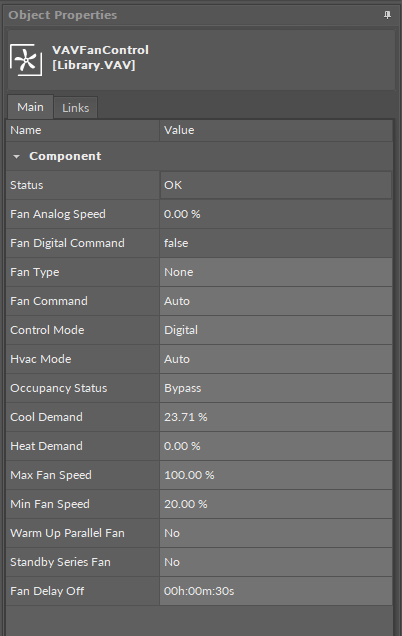 Status: informs about the status of the component; if the Fan Type/Fan Commend/Occupancy Status/HVAC Mode slot or one of the demand input slots has a null value then the status is fault, otherwise it is OK;