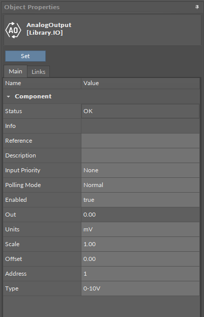 The AnalogOutput component includes an action that allows to set its Out value in case no Data Point class component is linked to it.