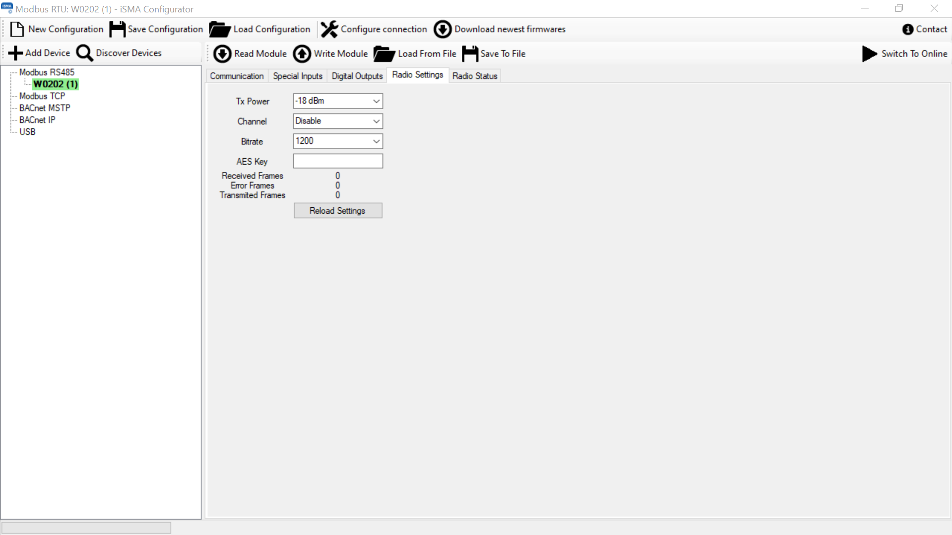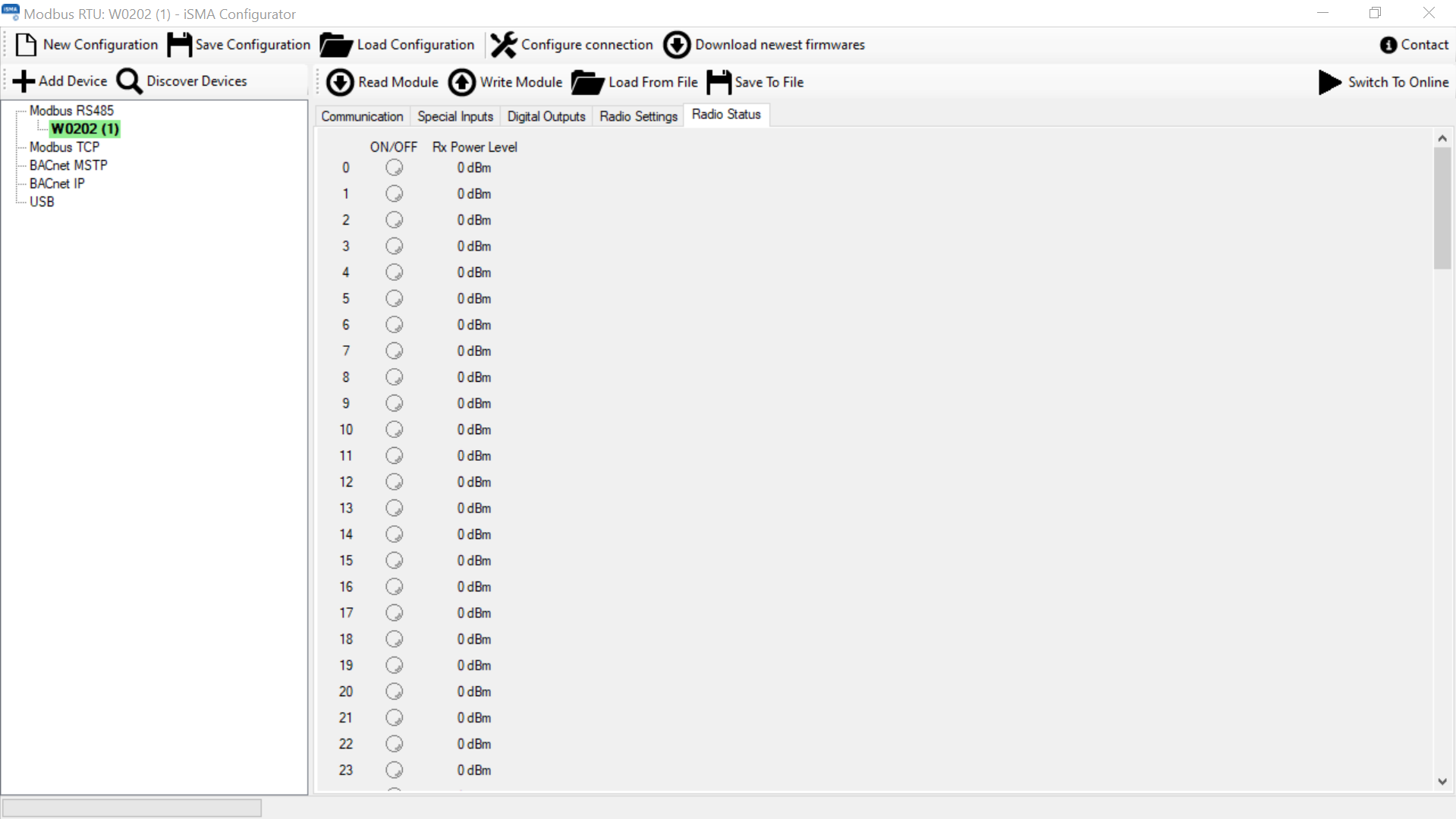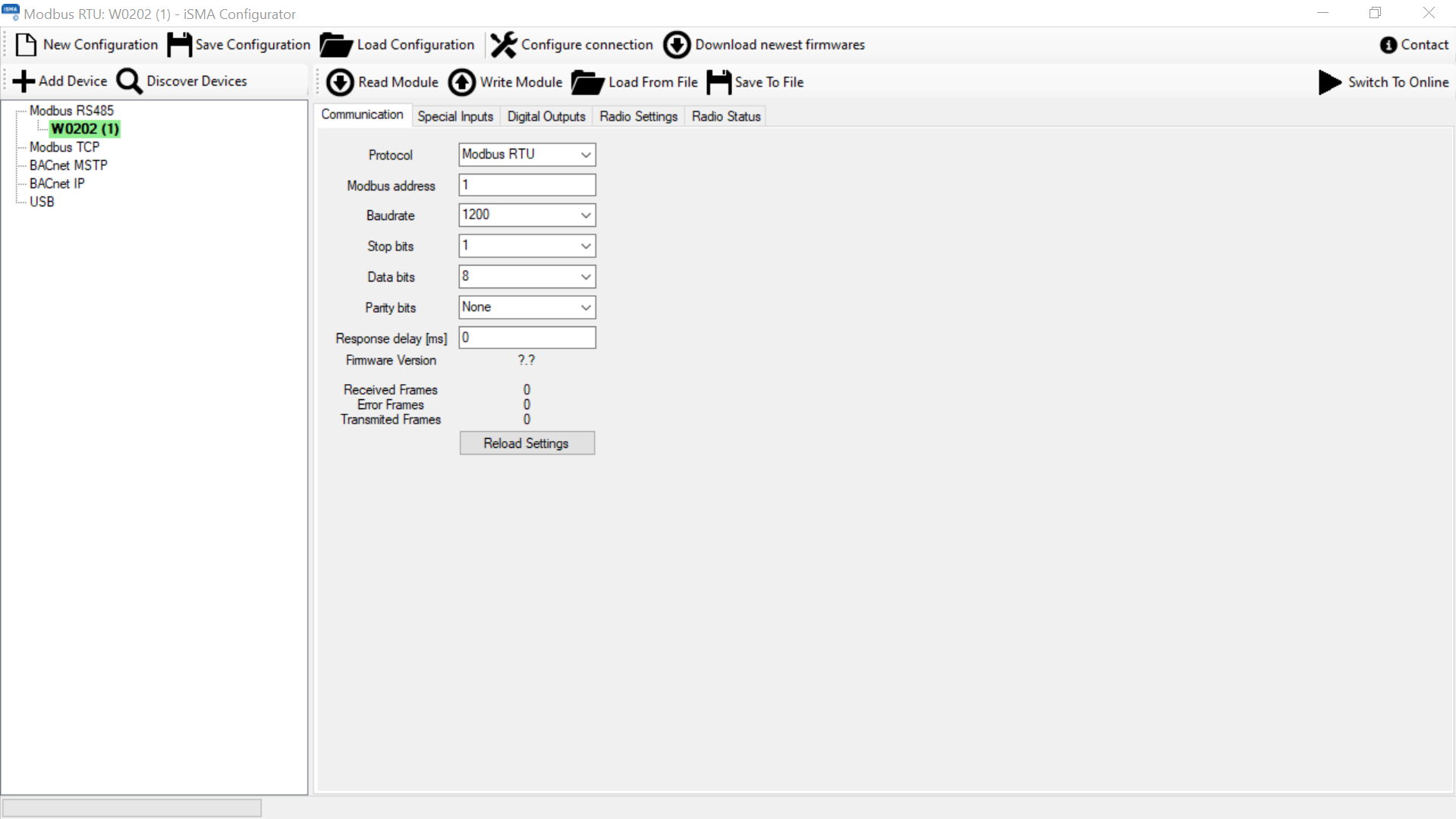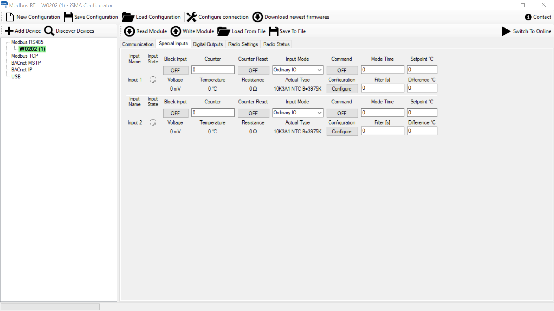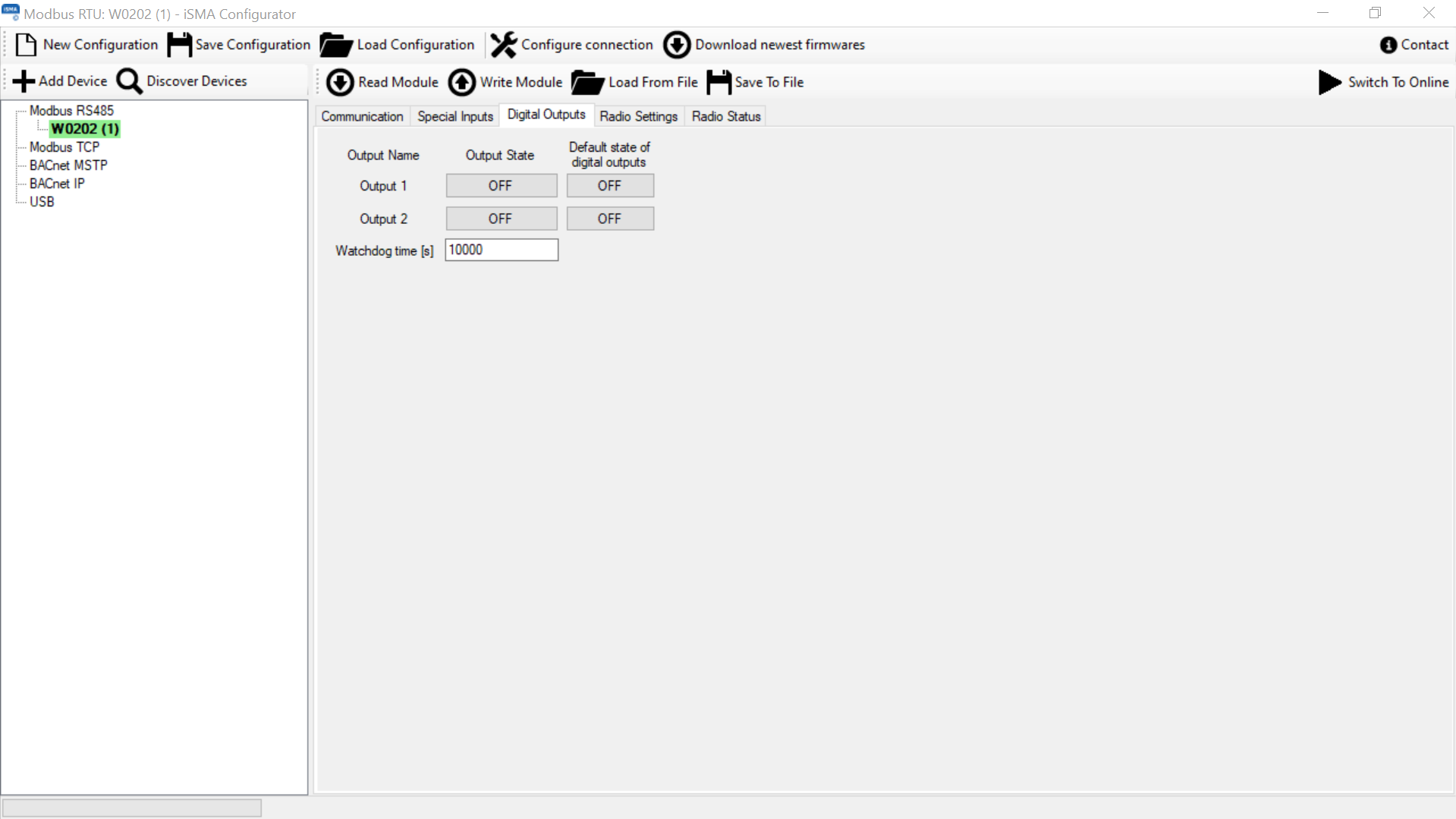 The iSMA-B-W0202 can be configured using Modbus registers or directly by USB connection and iSMA Configurator software. The iSMA Configurator can be downloaded from ismacontrolli.com. If the module is connected, it appears in the hierarchy tree window (left part of the screen). The next step is to read module configuration using the Read Module button or to read configuration from a file using the Load From File button.